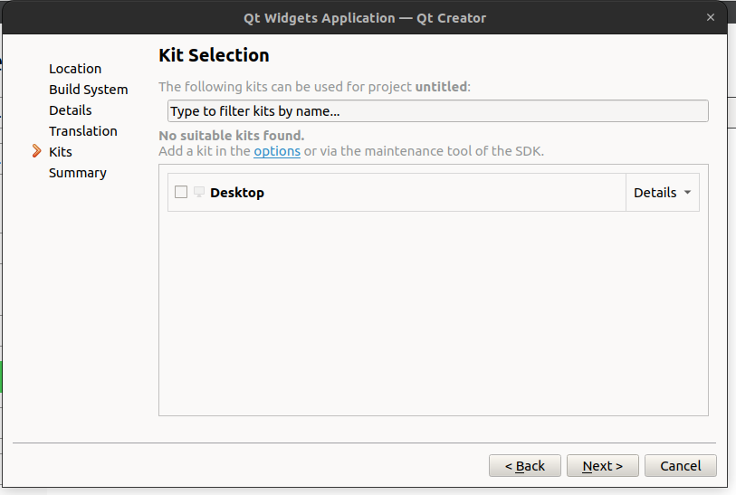 - In the Kit Selection step, make sure your development kit is correctly configured. This might involve selecting a specific compiler or Qt version, depending on your system and ROS2 setup.